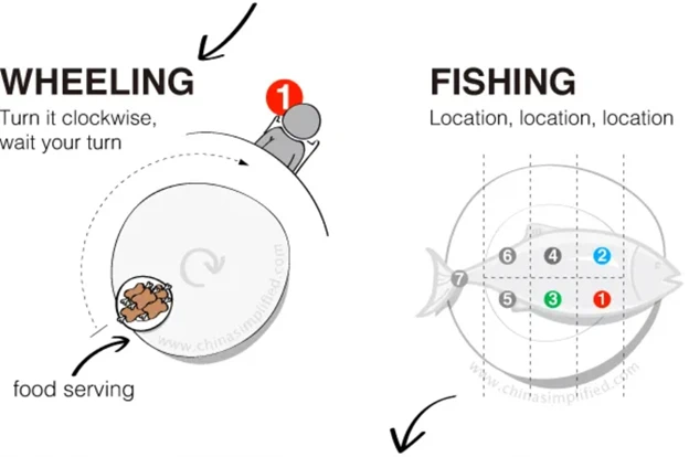 Поверните поворотный стол по часовой стрелке и дайте другим (особенно человеку на самом почётном месте) попробовать первыми. Не переживайте — блюдо ещё вернётся к вам. И никто не хочет быть тем, кто забирает последний кусок с общей тарелки.