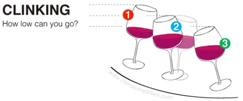 Что это за тайная игра происходит? «Танец скромности» продолжается! Когда два бокала чокаются, то, на какой высоте люди держат бокалы, показывает иерархию. Иногда они опускают бокалы всё ниже и ниже — вплоть до того, что стукаются о стол (хотя это уже худший сценарий). Когда хозяин произносит тост за вас, держите свой бокал ниже — так его бокал будет выше.